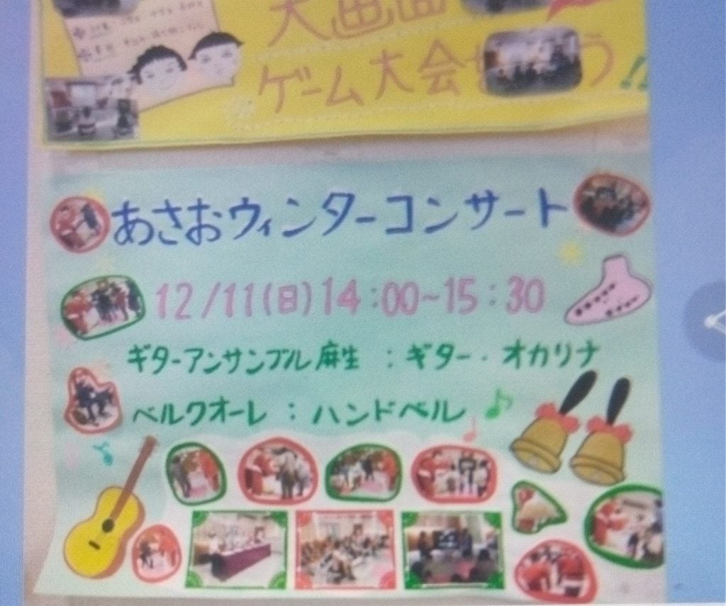 新百合ヶ丘にある「麻生市民交流館やまゆり」での年に一度の「やまゆり楽芸会」(毎年11月)の発表会のほか、麻生区の老人ホームのおしゃべり会等に招待されての演奏が年2~3回あります。2023年は、都合により、「やまゆり楽芸会」には、参加しない予定です。